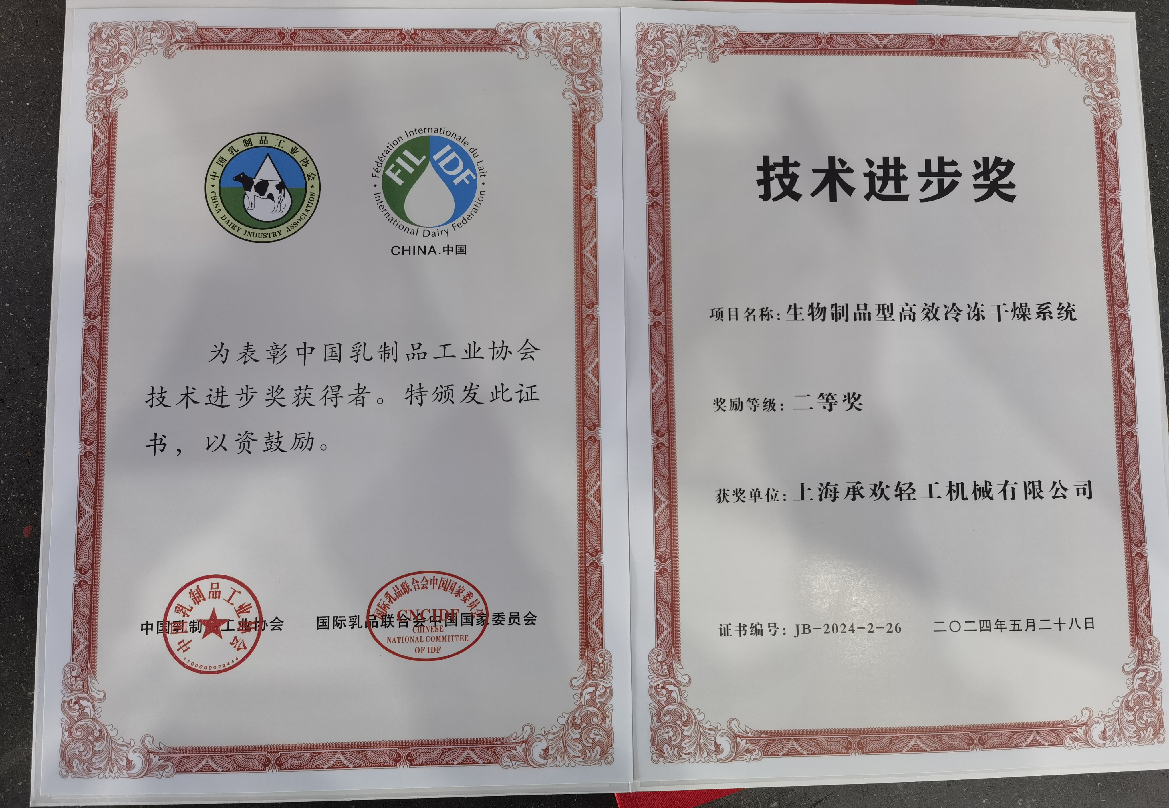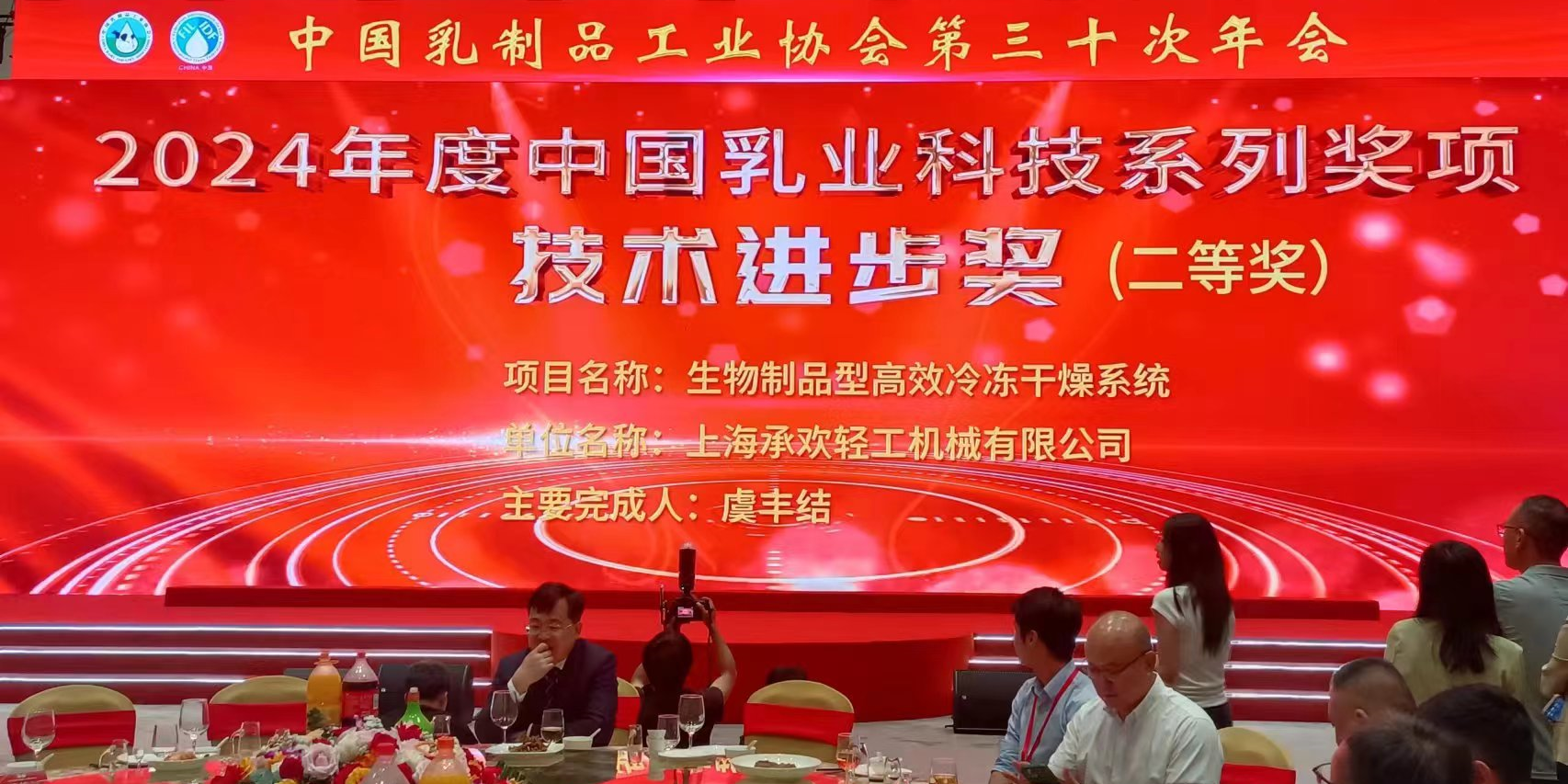 In order to continuously improve the level of technological innovation in the dairy industry and encourage scientific researchers and units who have made outstanding contributions in the invention and progress of dairy technology, the China Dairy Industry Association held the 2024 China Dairy Science and Technology Series Awards Ceremony. Among them, Shanghai Joy Light Industry Machinery Co., Ltd. won the second prize of the "Technical Progress Award", and the award-winning project was the "Efficient Freeze Drying System for Biological Products". This honor is a high affirmation of Tofflon Joy, as well as an encouragement and recognition for the active contribution to the high-quality development of China's dairy industry. We are confident in developing better equipment!