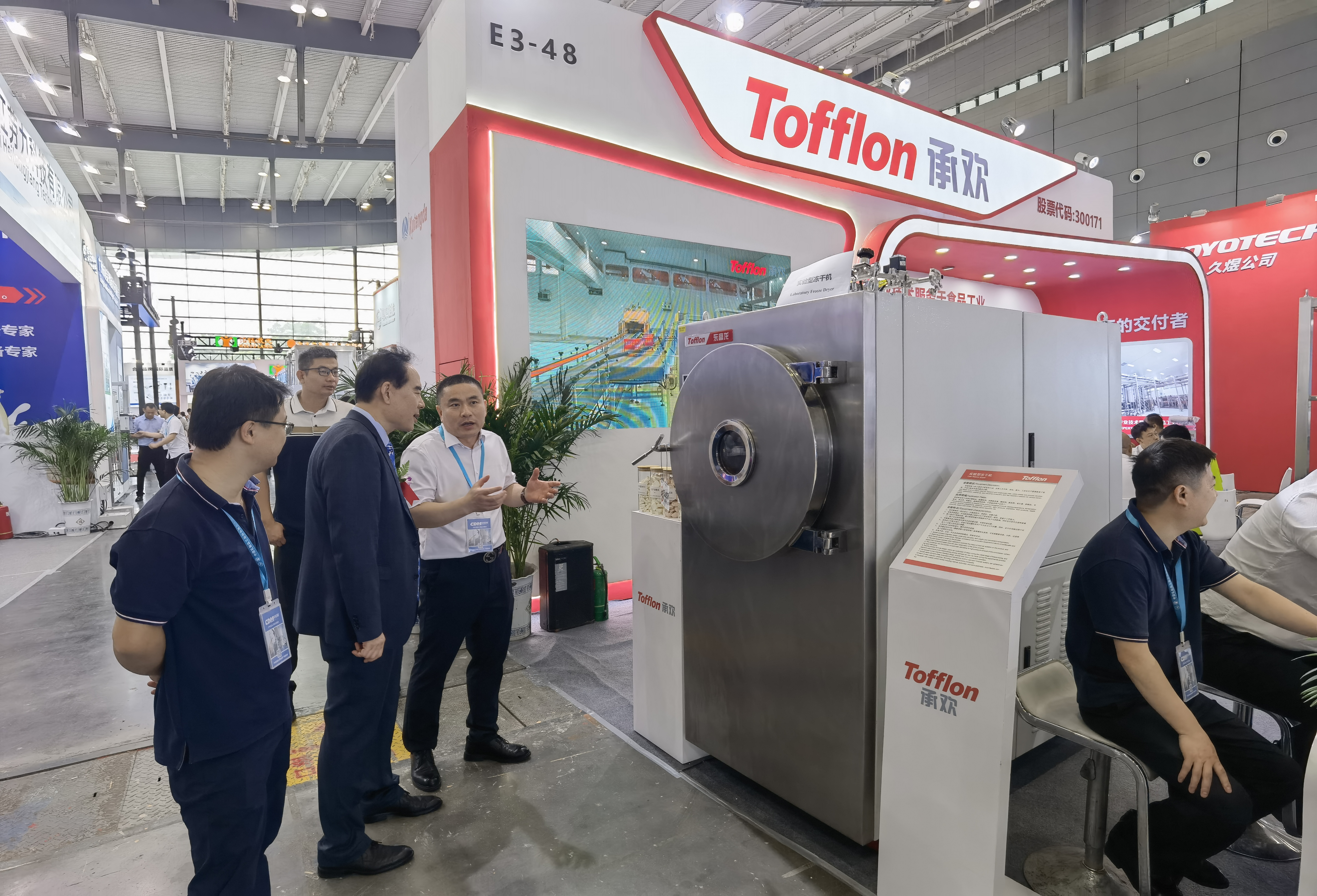 Mr. Liu Chao, Vice Chairman and Executive Deputy Secretary General of China Dairy Industry Association, visited the Tofflon Joy booth. Led by Mr. Yu Fengjie, General Manager of Tofflon Joy, he focused on visiting our independently developed and manufactured food freeze-drying machines and aseptic large bag filling machines, and gave high praise.