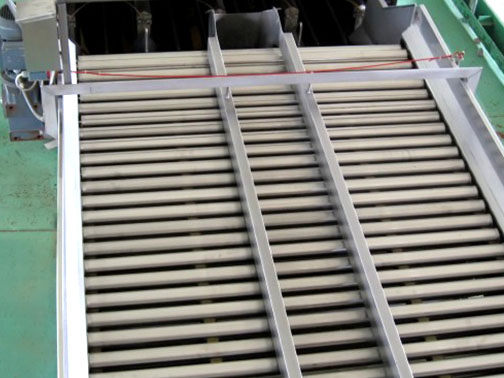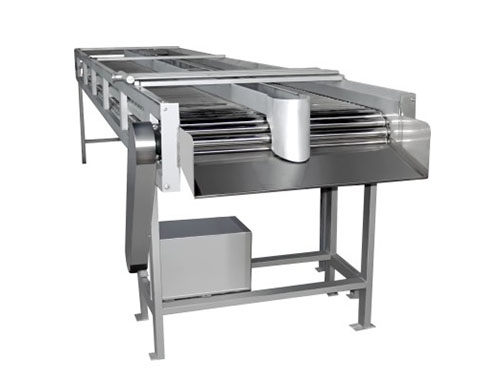 不銹鋼鏈條帶動(dòng)滾杠移動(dòng),滾杠在橡膠軌道上因磨擦而自轉(zhuǎn),從而帶動(dòng)果蔬自由旋轉(zhuǎn),配合人工檢選,挑去不合格果蔬。
