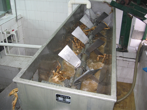 物料由一側(cè)進(jìn)入清洗機(jī),槳葉由電機(jī)帶動(dòng)旋轉(zhuǎn),對(duì)物料進(jìn)行攪拌、清理,同時(shí)將物料由一側(cè)推向另一側(cè),完成一個(gè)清洗周期。