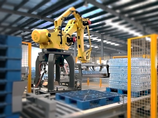 機(jī)器人碼垛機(jī)可以集成在任何生產(chǎn)線中,為生產(chǎn)現(xiàn)場(chǎng)提供智能化、機(jī)器人化、網(wǎng)絡(luò)化,可以實(shí)現(xiàn)啤酒、飲料和食品行業(yè)多種多樣作業(yè)的碼垛物流,廣泛應(yīng)用于紙箱、塑料箱、瓶類(lèi)、袋類(lèi)、桶裝、膜包產(chǎn)品及灌裝產(chǎn)品等。配套于三合一灌裝線等,對(duì)各類(lèi)瓶罐箱包進(jìn)行碼垛。