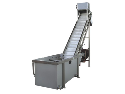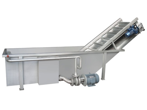 果蔬直接進(jìn)入鼓泡清洗機(jī),通過高壓鼓風(fēng)機(jī)產(chǎn)生的氣體使得浸泡池內(nèi)的水產(chǎn)生大量氣泡并不斷翻滾,對果蔬進(jìn)行全面徹底的浸泡清洗,利用循環(huán)水清洗效果更好,然后通過離心泵,由自帶的提升裝置將水果送入下道工序;提升段設(shè)有噴淋裝置,可對果蔬進(jìn)行二次清洗。清洗過程可根據(jù)需要加入適當(dāng)?shù)那逑聪疽?,清洗殺菌效果好?/p>